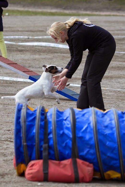 Parpansalin epikset oli oikein viihdyttävät, tai ainakin me viihdytettiin ;) ennen avoimen luokan ekaa rataa Terhi kiskoi palloa zikin suusta ja se vieri masterin nenän edestä. No radalla päästiin kolmantena olleelle puomille, josta masteri hyppäs puolesta välistä alas ja lähti etsimään tätä palloa ihan hullun lailla! Lopulta se löys Soolon narulelun maalista ja juos se suussa ympyrää..huoh..enpä ois uskonu, että yks pallo saa pienen terrierin elämän noin sekasin, kun yleensä se ei radalla häiriinny mistään, vaikka pallohullu onkin. Uusinnalla se pysyi jo radalla, mutta vieläkin oli pallo mielessä ja tuli ihan tyhmiä virheitä. 1-luokka meni paremmin. Yksi putken väärä pää, mutta muuten kivaa menoa. Masteri meni saman radan myös Kristan kans ja lähti puolessa välissä ettimään mammaa, eikä edes paniikissa mua löytänyt vaikka seisoin vieressä ja huusin sitä :D Lopulta se mut löysi ja pystyi jatkamaan radan loppuun.