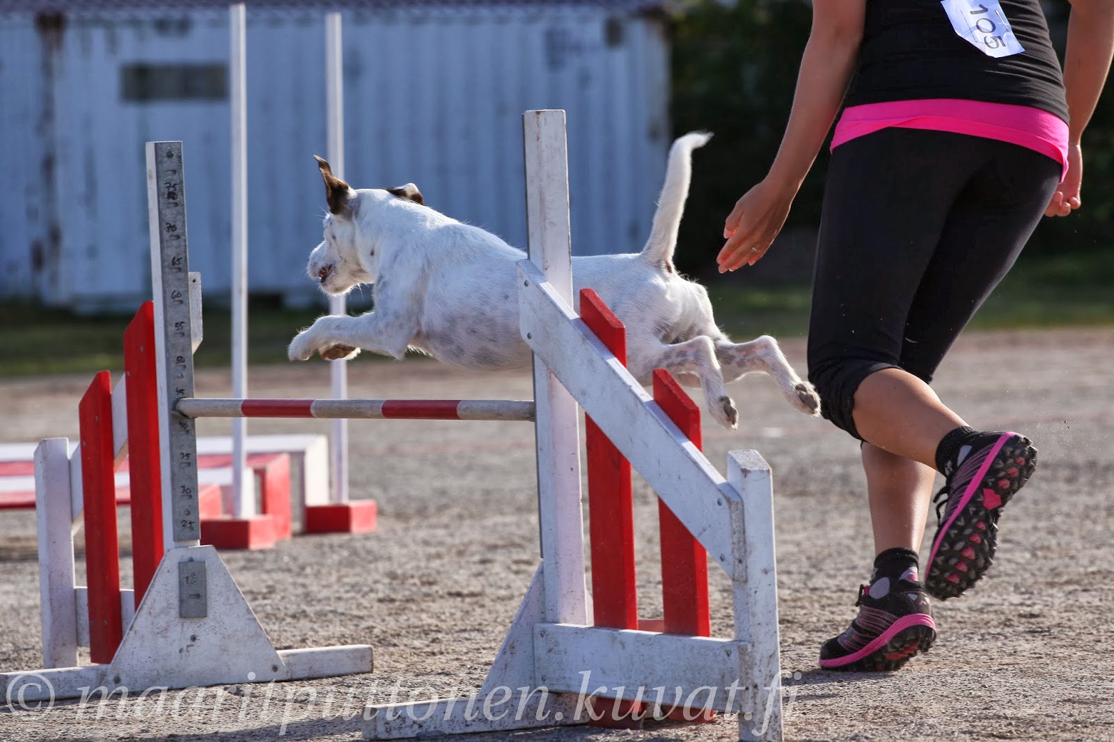 Lokakuun alussa lähdin siskolle kylään ja luvassa oli erkkaria ja agilitya kirkkonummella. Kiva oli päästä kisaamaan ihan vieraaseen paikkaan ja vitsi minkä itsevarmuuspuuskan sain ekalle radalle mennessä. Rataantutstuessa tein asioita erilailla kun muut mutta en antanu sen häiritä. Radalla ohjasin just niinku olin suunnitellut ja masteri teki hienot kontaktit yms! Okseri oli sijoitettu vaikeaan paikkaan ja siinä sitten rima putos aika reilusti kun käänsin yläkroppaa koiran ponnistaessa. No vitosella maaliin ja sijoitus 6/21 ja vain 7 koiraa sai tuloksen! Aika oli hidas, mut ehkä oltiin hieman kohmeessa ja pohja oli uus ja outo ja lisäks kontakteilla tuli kunnon stopit. Ekalla radalla olin jättänyt palkan heti hallin oven taakse ja sinne masteri juoksikin suoraan maalista. Toisella radalla tein saman ja siinä se kostautui, koska masteri yritti oikoa kaikki esteet päästäkseen palkalle. No ei mitään tästä opittiin, ettei se kestä kahta rataa palkka valmiina. Hyppäriä varten jätin palkan vaivihkaa autolle ja sinne juostiin sitten yhdessä se hakemaan. Tällä radalla kaarteet veny reilusti, ja alun päällejuoksussa olin tiellä ja taas rima tippui! Muuten puhtaasti ja kelpo aikaan kaarteista huolimatta. Nollaratatreeni on siis tuottanut tulosta, mutta rimat on herkässä tällä hetkellä.