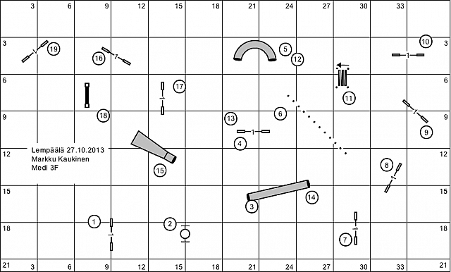 Tää rata meni oikein hyvin! Kakkoselle niisto ja kolmoselle vekkaus, jotta keinulle tuli hyvä linja. Putki takaaleikaten ja siitä A:lle ja tää alku meni ehkä parhaiten ja näteillä linjoilla. Seiskalle moni teki vastakäännöksen, mutta ite päädyin vaan lähettämään Masterin kaukaa, jolloin se kääntyikin hyvin keppejä kohti. Ysille pakkovalssi, joka kääntyi hyvin ajoissa. Ainut kökkö kohta oli, kun kymppiputken jälkeen koira hukkui hektkeks mun selän taa ja piti odotella sitä jonkun aikaa. 12.hypyn jälkeen lähdin hyvin liikkeelle ja ehdin tehdä liikkuvan valssin 13 jälkeen ja kääntämään pituudelta kohti putkea. Tässä moni koira meni kepeille! 17.hypylle moni teki myös vastakäännöksen ja valsseja yms, mutta päätin ite vaan vähän linjata koiraa ja odottaa paikallaan, että koira kiipee kontaktille ja niinhän se menikin hyvin. Täysiä maaliin hienolla puomin kontaktilla ja NOLLAhan sieltä napsahti :) Masteri oli selvästi hidastanut vauhtia ekan radan liukasteluiden jälkeen, joten sijoitus oli kuuden. Tosin koiria oli se 51, eli ihan kelpo sijoitus ;) Ja ei me voittajalle hävitty kun vajaa 3 sekkaa. Harmi ettei ratoja saatu videolle kun raumalaiset oli ylläri taas peräjälkeen kaikki! Oikein positiivinen kuva jäi tästä tuomarista, vaikka vähän selvästi vielä omaa rataprofiilityyppiään hakikin ja esim hyppärillä oli vähän outoja linjoja esteille.